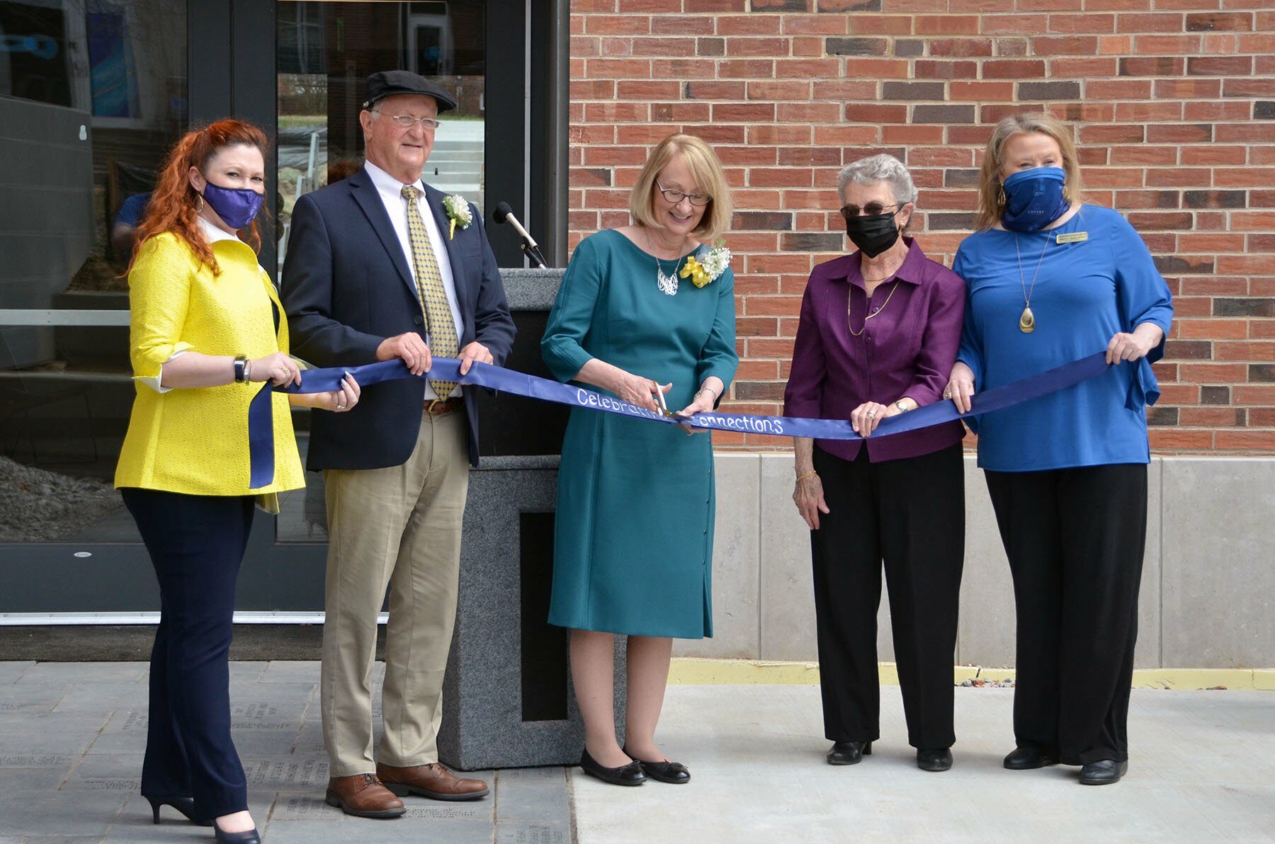 Participants in the ribbon cutting are (left to right) Christi Fulton Ellis ’96, associate vice president for institutional advancement; Jim Bickel, member of the Cottey College Board of Trustees; Dr. Jann Weitzel, President of the College; Sheryl Crow Mowry ’58, alumna; and Sherri Taylor, Senior Donor Advisor.